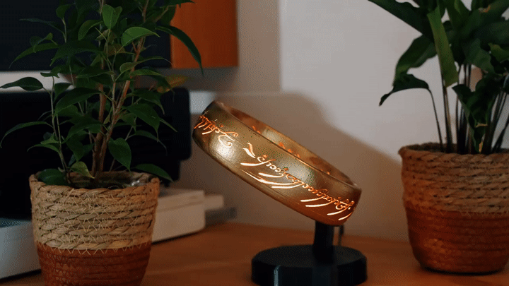 Allumée, cette lampe inspirée de l'anneau unique révèle ses inscriptions en "noir parler", donnant l'impression que l'anneau est chauffé par les flammes du Mont Destin